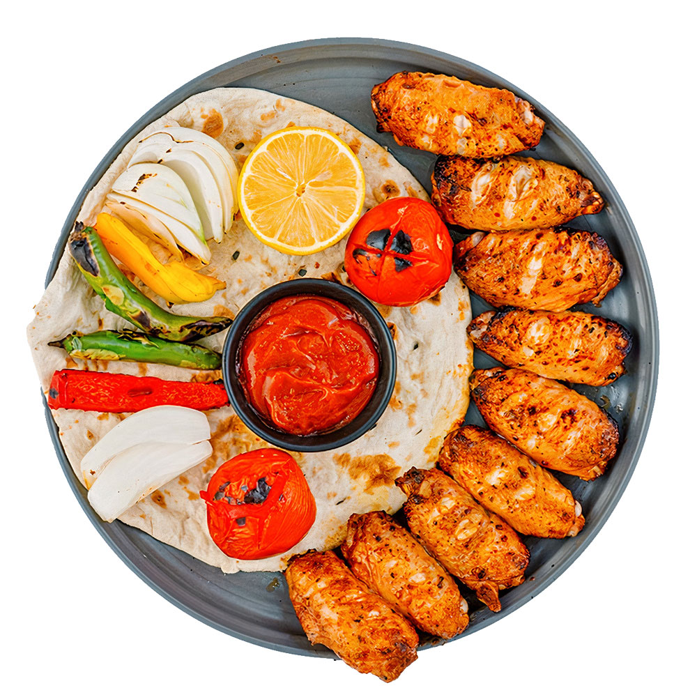 سه عدد شیشلیک سیگنیچر ، نصف جوجه ارگانیک همراه با گوجه ، لیمو ، سبزیجات کبابی و سس ریحان