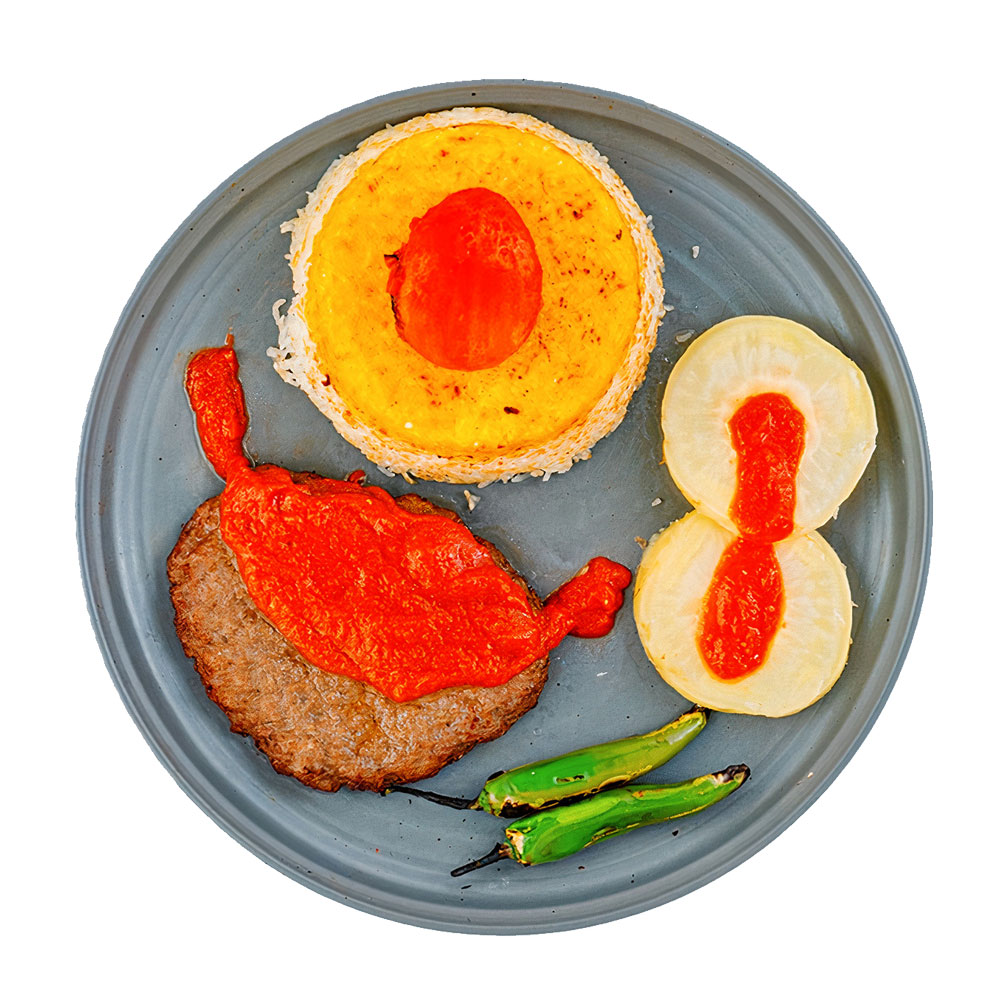 یک عدد همبرگر 200 گرمی گوشت مخصوص گوساله ، چهار عدد تخم مرغ نیمرو شده ، نان اسلایدری و نان تست