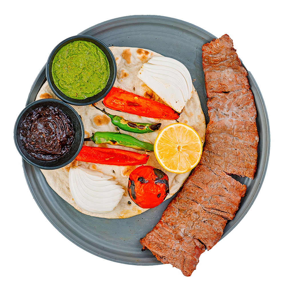 350 گرم فیله مرغ مزه دارشده با ماست و ادویه همراه با گوجه، لیمو، سبزیجات کبابی و سس ناردونی